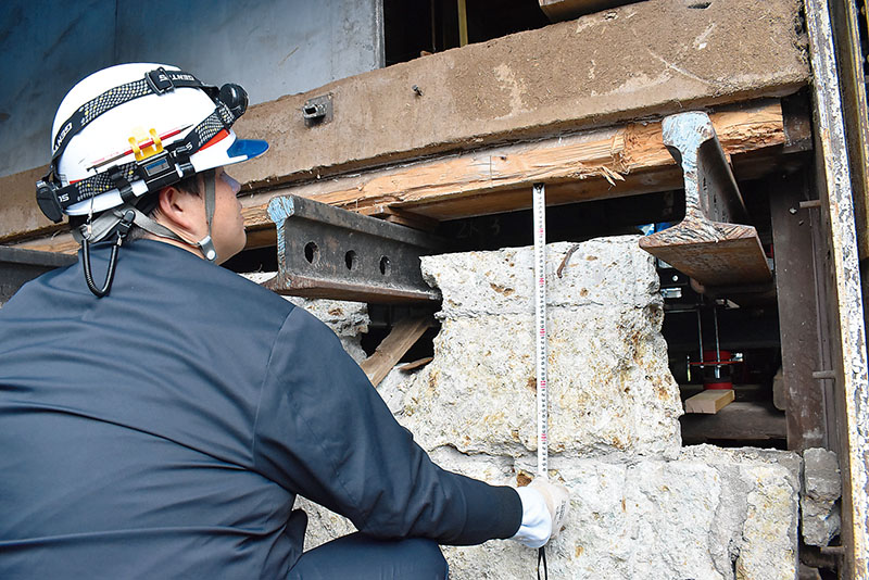 揚屋工事は建物が壊れないよう少しずつ持ち上げ、基礎工事などを行う工法。現在の旧黒須銀行の基礎は大谷石製で、耐震性を高めるために鉄筋コンクリートで作り変える。
