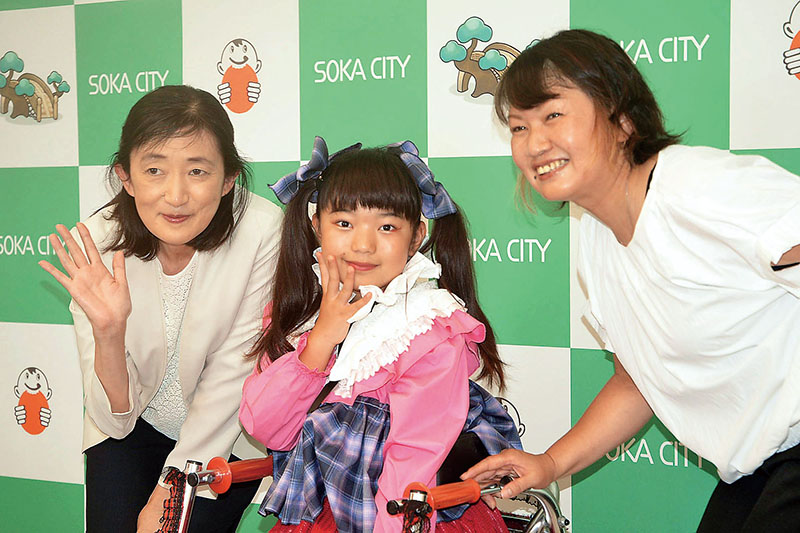 車いすの生活を続ける草加市の小学校4年三好未来さん(10)は、モデルやアイドルとして活動を続け、2月には英ファッションショーに出演した。20日に同市役所を表敬訪問し、当時の様子を振り返った。