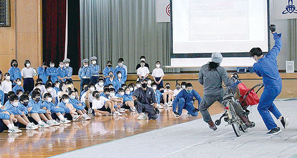 生徒のほぼ全員が自転車通学をしているという熊谷市立妻沼西中学校(斎藤健一校長、生徒数217人)の体育館で、交通安全教室が開かれた。スタントマンにより事故が再現され、生徒らが目の前で恐怖を実感した。