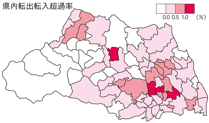倉橋教授は、県の資料に基づき、コロナ禍における市区町村の転出転入超過率を算出した。結果、さいたま市大宮区(2・1%)、緑区(1・9%)、西区(1・3%)、伊奈町(0・8%)、上尾市、鶴ケ島市、さいたま市浦和区(いずれも0・7%)、白岡市、蓮田市(同0・6%)など、県央部を中心に転入超過率が大きかった。