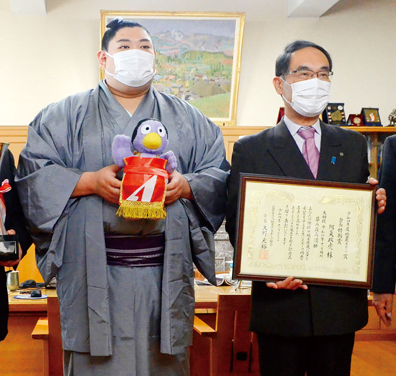 阿炎関も思わず笑顔…特製コバトン「強そう」 埼玉県がスポーツ特別賞を贈呈 知事の意外な過去も