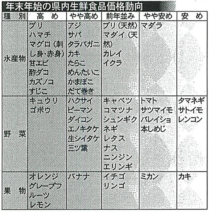 県は主要食品と石油について年末年始の価格動向を発表した。水産物と果物、灯油は高めで、野菜はやや高め、ガソリンは前年並みとなる見通し。県消費生活課は「野菜や水産物はそれぞれの取れ高によりバラつきがあるが、総じて高めとなりそうだ。水産物では、たまたま今年はあまり取れなかったものもあるが、原油高が影響した可能性もある」との見通しを示した。