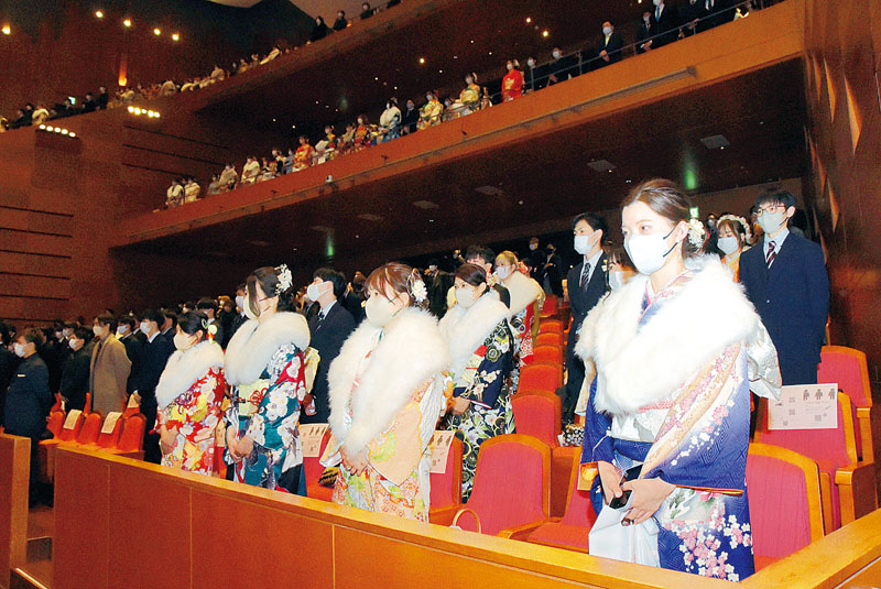 新型コロナウイルス感染防止のため、マスク着用で周囲との間隔を空けて式に臨む参加者たち=8日午後、川越市新宿町のウェスタ川越