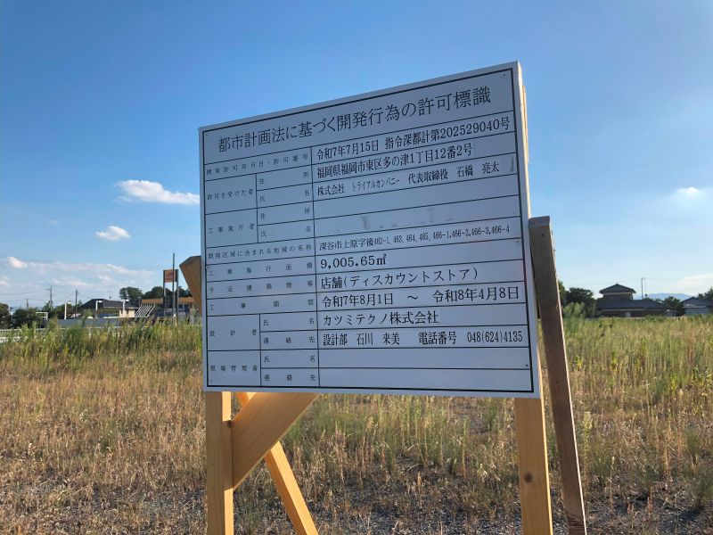 ディスカウント総合スーパーなどを運営するトライアルカンパニー(福岡県福岡市)は5月21日、埼玉県に、大規模小売店舗立地法に基づき、「スーパーセンタートライアル深谷川本店」(深谷市上原)の新設を届け出た。新設予定日は2026年1月22日。