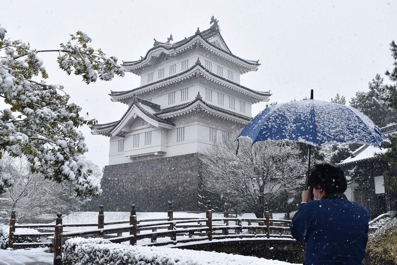 低気圧の影響で10日の県内は午前中から雪が降り始め、大雪警報が出された。通行人は滑って転倒しないよう身を震わせながら歩き、観光地では銀世界の風景を写真に収めるカメラマンの姿も。日中の気温もほとんど上がらず、週前半の温かさから一転、厳冬の凍える寒さが戻った。
