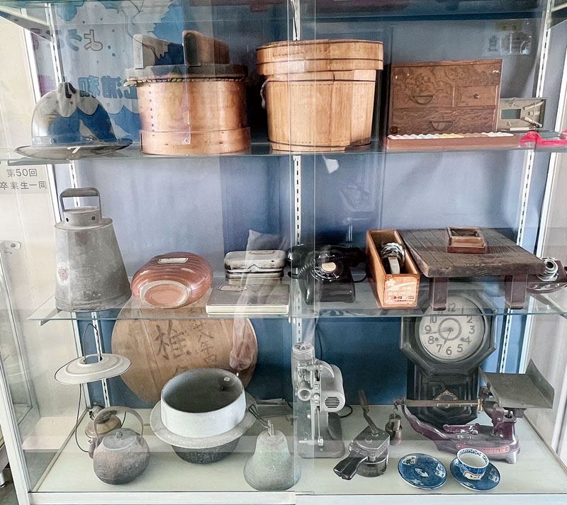 三村悟校長は「地域の人の思いがあるので、道具類を大切に保管してきた。もし活用していただけるなら、無駄にしないで済む」。河地洋明教頭は「貴重な物は残していきたい」として、一部の道具の展示スペースを設けた。