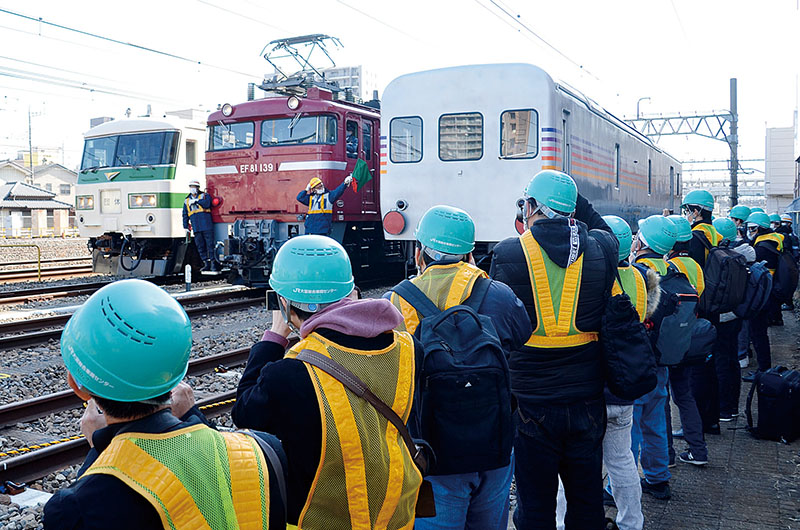 事前に申し込んだ参加者は大宮駅からツアー限定の電車に乗り込み、与野駅近くの大宮操車場留置線で、寝台特急「カシオペア」などで活躍した機関車「EF81形」と寝台客車の予備電源車「カヤ27形」の連結、切り離し作業を間近で見学した。