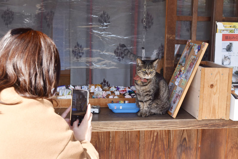 埼玉県行田市埼玉の前玉神社。猫がいる神社として知られ、猫を目当てに訪れる参拝客が多い。さいたま市から訪れ、猫の写真をスマートフォンで撮影していた菊地智子さん(43)は「自分も猫を飼っているけど、すごくかわいかった」と語った。同神社の田島和文宮司(56)も「猫に癒やされるという参拝客は多い」と話す。