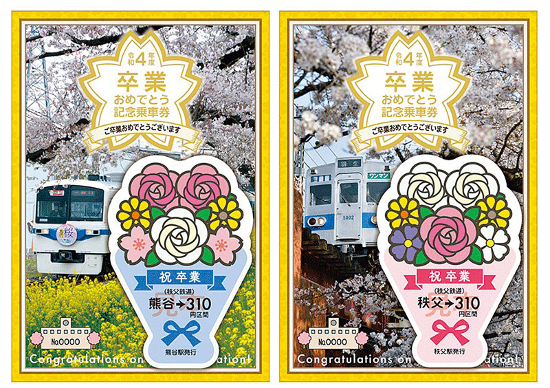 通学電車から「おめでとう」 沿線の高校卒業生へ秩父鉄道が記念乗車券 デザイン2種、駅窓口で販売 2023/03/05/13:57 「卒業おめでとう記念乗車券」イメージ(秩父鉄道提供) この写真の記事に戻る