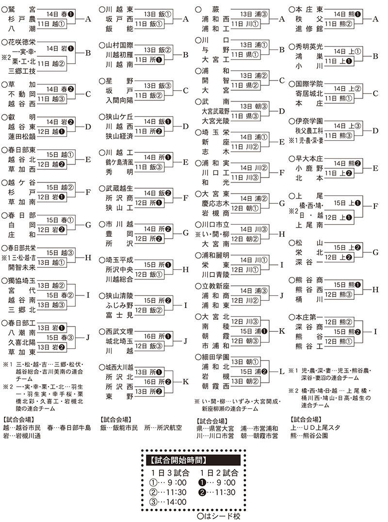 昨春の県大会4強の市川越と上尾は代表決定戦から登場。市川越は西部G組の豊岡―所沢の勝者と、上尾は北部F組の5校連合―上尾南の勝者と顔を合わせる。