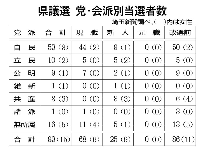 9日に投開票された埼玉県議選で、今後4年間の県議会を担う93人の顔触れが決まった。現職は68人、新人は25人が当選。自民は53議席で選挙前の50議席から伸ばし、単独過半数(47議席)を守った。立民は前回と同じ10人が当選。公明は現有9議席を維持した。共産は新人3人が当選したものの現有6議席から半減。維新は1人が当選し、県議会初の議席を獲得した。