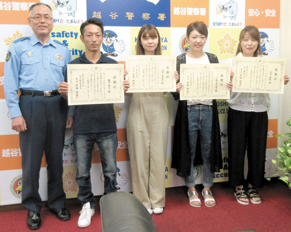 川に飛び込んだ女性を救出したとして、越谷署は3日、越谷市の会社員嶽内智文さん、幸手市の作業療法士矢沢奈津美さん、川口市の児童指導員二瓶早矢香さん、越谷市の同出井麻純さんの4人に感謝状を贈った。