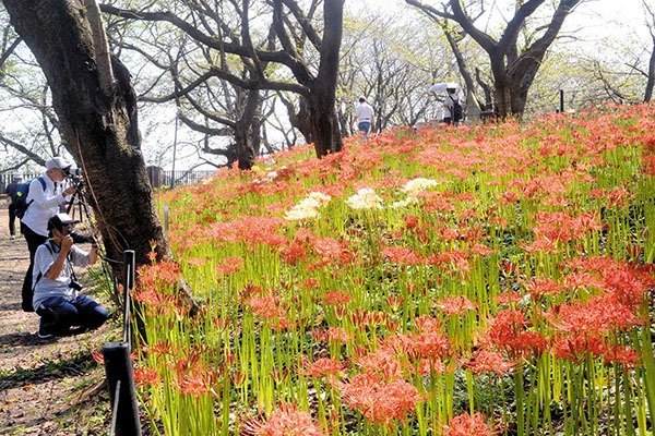 幸手市権現堂堤のヒガンバナ(曼珠沙華)が五分咲きほどに花を咲かせ、来場者を楽しませている。権現堂公園管理事務所によると、暑さが長引き、開花は例年より1週間以上遅れているという。