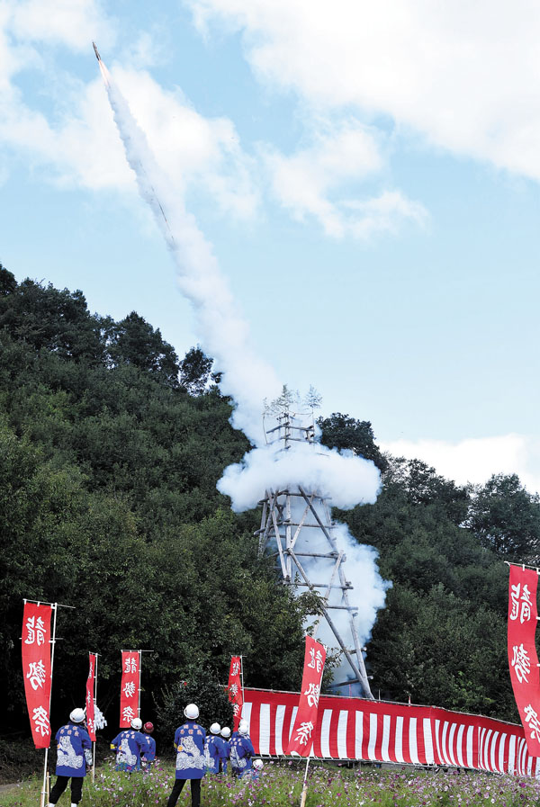 昨年3月に「秩父吉田の龍勢」として、国の重要無形民俗文化財に指定された、秩父市下吉田の椋神社の例大祭「龍勢祭」が13日、同神社周辺で行われた。台風が心配されたが、約4万1800人(主催者発表)が訪れる中、地元住民らで組織する流派が手作りしたロケット「龍勢」が秋空へ天高く打ち上げられた。