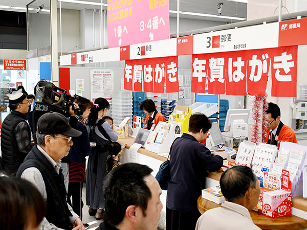 毎年、開局と同時に年賀はがきを買い求めるという同市南区の主婦中野美智子さん(79)は「友達や親せき、きょうだいに季節のあいさつを出します。今年は平穏に過ごせたので、来年もそうだといいですね」と話した。