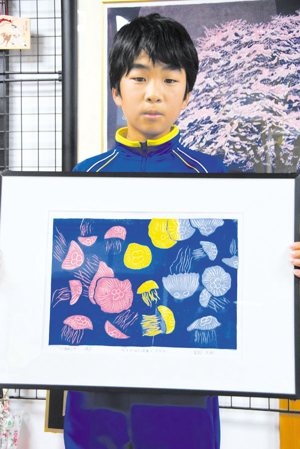カラフルに輝くクラゲで最優秀賞 東秩父の6年生、日本版画会展で受賞 色のグラデーション良いと評価 2019/12/30/00:00 日本版画会展の小学生高学年の部で最優秀賞を受賞した高野志成君と作品=東秩父村の自宅 この写真の記事に戻る