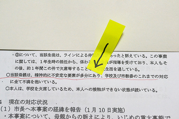 <川口いじめ>母は精神的に不安定…市教委文書に元生徒の母を中傷する記述 母が批判「悪質、責任転嫁だ」 2019/02/08/00:00 母親に関する不適切な表現がある市教委の報告書 文部科学省が開示した関連文書(手前)と県教委が開示した文書 この写真の記事に戻る