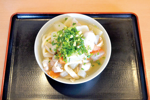関東では「けんちん」と呼ぶが、讃岐地方では「しっぽくうどん」(620円)。野菜のほか、豚肉と油揚げ、練り物の天ぷらが入っている。開業当初、鶏肉を使用していたが、肉汁うどんを参考に豚肉に変えたところ、こってり味が受けた。冬季の限定品だが、土曜日は昼前に売り切れるほどの人気商品となった。