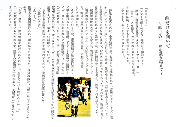 昨年12月、1~3年生までの全学年全クラスの道徳授業にA4サイズ用紙3枚つづりの手作りの教材が配布された。タイトルは「前だけを向いて 原口文仁 癌(がん)を乗り越えて」。教材には、医師から大腸がんであることを告げられ、頭が真っ白になったと同時に現実感を伴って死が迫り、「なぜ、僕が…。僕は野球を続けられるのか…。生きていけるのだろうか」という当時の原口選手の不安な気持ちを率直に伝えている。