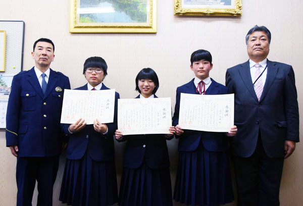 川島町立西中学校(大野喜裕校長)の全校集会で25日、道路で転倒して動けなくなった町内の男性(83)を救助した2年生の渡辺咲也(さや)さん(13)、後藤姫乃(きの)さん(13)、大森涼音(すずね)さん(14)に、東松山署(愛敬英司署長)から感謝状が贈られた。