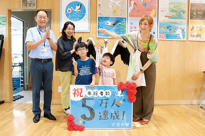 びっくり!人気のコウノトリを見学できる「天空の里」来館5万人を突破 客驚き、鴻巣市長が“伝説米”贈呈 2023/08/12/15:44 来館5万人目を喜ぶ(左2人目から)宮澤淳子さん、三原庸輔君、慶裕君、美智さん。左は並木正年市長=10日、鴻巣市コウノトリ野生復帰センター「天空の里」(鴻巣市提供) この写真の記事に戻る