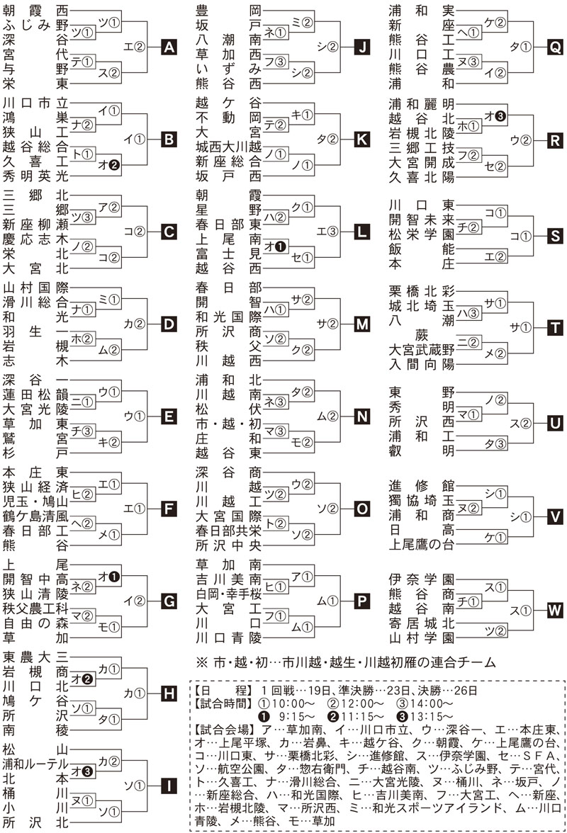 <高校サッカー>埼玉大会1次予選の組み合わせ 23組に分かれ19日に開幕 武南などシード校は決勝Tから出場 2023/08/17/12:27 高校スポーツ 全国高校サッカー埼玉大会1次予選の組み合わせ 第102回全国高校サッカー選手権埼玉大会の1次予選は19日に開幕する。23組に分かれたトーナメントを実施し、各組を勝ち上がったチームが決勝トーナメントの出場権を得る。 もっと読む ツイート シェア シェア スポーツの記事一覧 埼玉新聞のHOMEに戻る