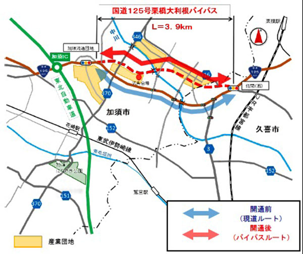 渋滞緩和や所要時間の短縮に見込み 栗橋大利根バイパスが完成、埼玉の国道125号バイパス全線が開通 2020/03/22/00:00 交通情報 加須市 久喜市 県内の国道125号バイパスが全通 北東部地域を東西に結ぶ広域的な幹線道路となっている国道125号の栗橋大利根バイパスが20日、開通した。 開通したのは久喜市佐間から加須市北大桑の区間で延長約3・9キロ。1970(昭和45)年に都市計画決定され、2007(平成19)年度から事業に着手した。 総事業費約93億円となる4車線バイパスの開通により、現道の渋滞緩和や、久喜市佐間西交差点から加須IC(インターチェンジ)間の所要時間が約7分短縮されるなどアクセス向上が見込まれている。この完成により、県内の国道125号バイパス全線が開通した。 ツイート シェア シェア 経済・社会の記事一覧 埼玉新聞のHOMEに戻る