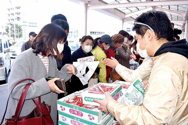新型コロナウイルスに負けないように、イベント「コロナに負けるな!助け合いマルシェ」(同実行委員会主催)が24日、秩父市宮側町の秩父鉄道秩父駅前で始まった。休校や行事の中止、観光客の減少により影響を受けている地元業者の商品を購入して盛り上げることが目的。税込み500円のワンコインで、飲食店の特製弁当や農産物などが販売され、にぎわいを見せた。