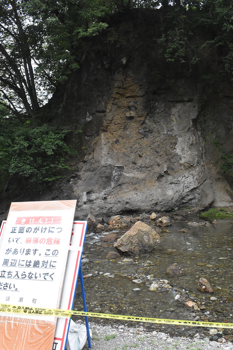 町によると、18日に付近を散歩していた近隣住民が崩落に気が付き、役場に連絡。町や県が注意喚起の看板や規制線テープを設置した。22日現在も、河川には崩れた岩石が残されている。