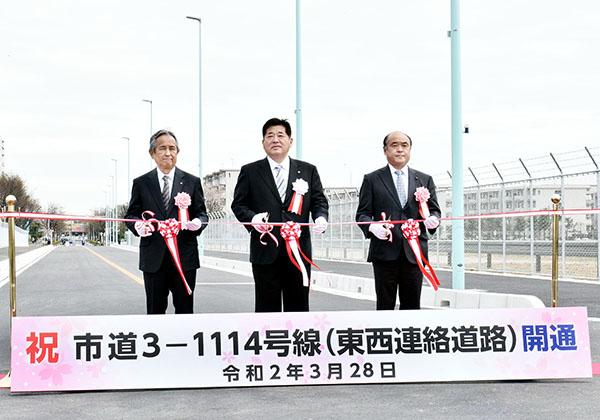 所沢市並木の米軍所沢通信基地を貫く東西連絡道路が28日開通し、記念式典と渡り初めが行われた。新型コロナウイルス感染拡大防止のため、式典の規模は、当初の半数以下となり、関係者約30人が出席した。米軍関係者は出席しなかった。