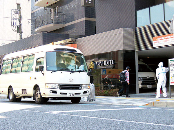 <新型肺炎>自宅待機の軽症者ら、新都心のアパホテルで受け入れ 未就学児の患者らバスで到着