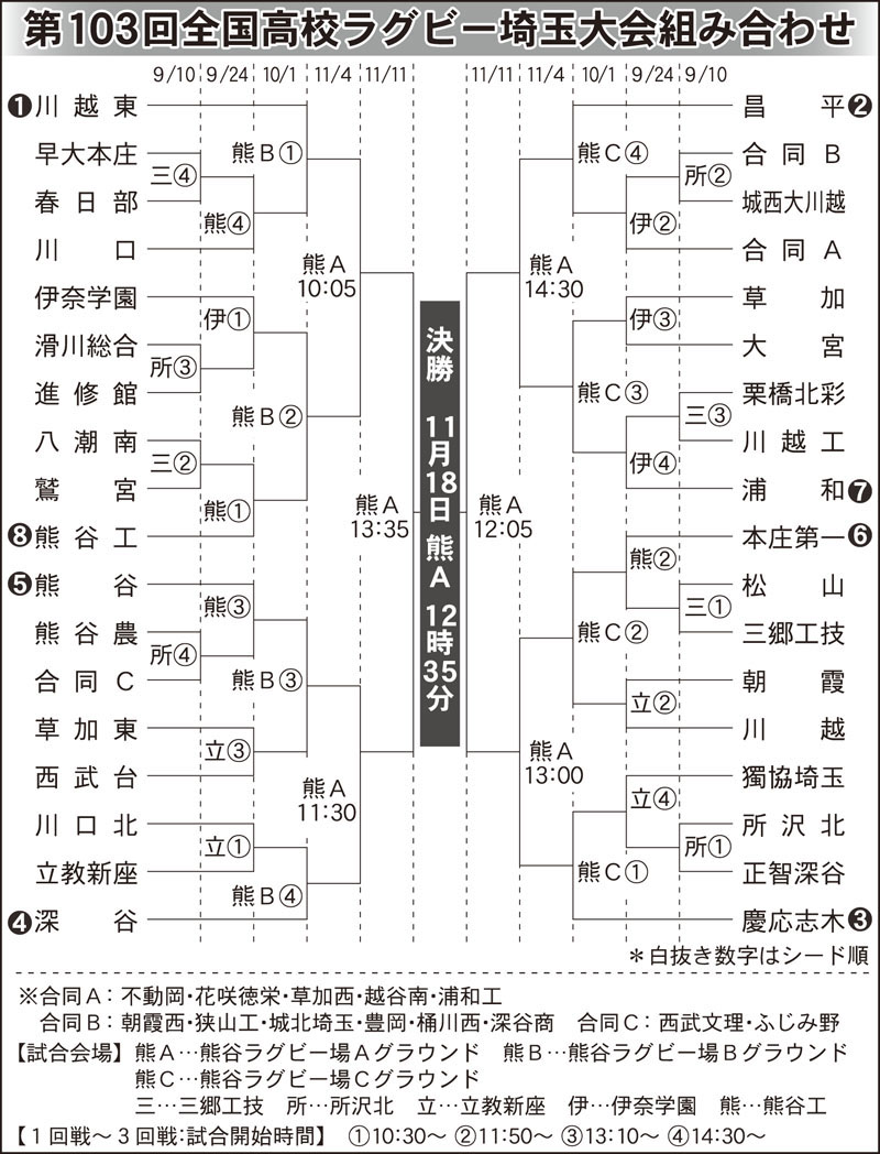 <高校ラグビー>埼玉大会の組み合わせ あす10日開幕、激突36チーム 決勝11月18日、予想される試合展開