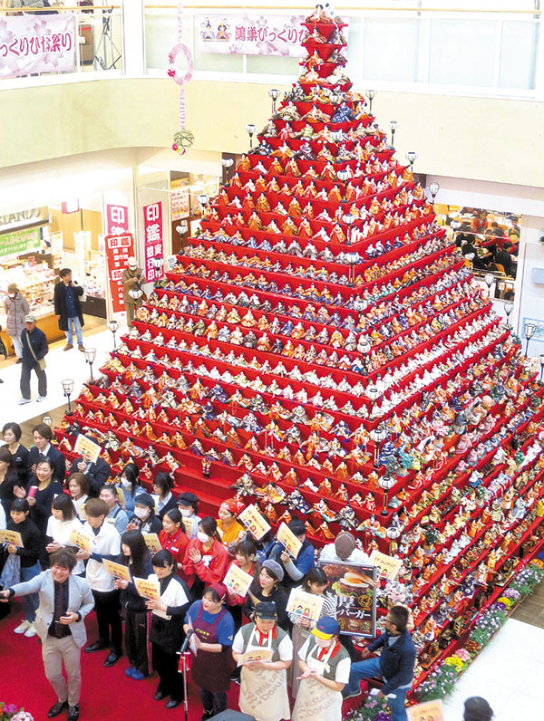 鴻巣市の鴻巣びっくりひな祭り2019が20日、メイン会場のエルミこうのすショッピングモールで始まった。高さ7メートル、31段の日本一高いピラミッドひな壇には、約1830体のひな人形が飾られた。展示は3月10日まで。