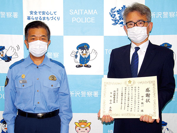 同署によると、6日午後4時ごろ、所沢市くすのき台地内で下半身を露出した30代男を、20代の女性が目撃。女性は「露出狂。捕まえてください」などと叫ぶと、逃走した男を百メートルほど追い掛けた。女性の叫び声に気が付いた田中さんは、目の前を通り過ぎようとした男を制止させ、右腕をつかんで捕まえた。その後、女性や通行人らと協力し、男を警察に引き渡した。