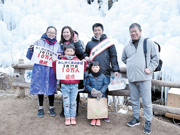 横瀬町芦ケ久保にある氷の芸術「あしがくぼの氷柱(ひょうちゅう)」(24日まで)が17日、来場者10万人を達成した。昨年に続き2年連続で、昨年は最終日に達成したが、今年は昨年より1週間早かった。10万人目となった所沢市の自営業月井忍さん(30)家族に記念品が贈呈された。