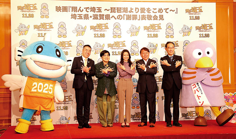 埼玉県をとことんいじって話題を呼んだ映画の続編「翔(と)んで埼玉 ~琵琶湖より愛をこめて~」が11月23日に全国公開されるのを前に、出演する俳優の二階堂ふみさん(29)と加藤諒さん(33)、武内英樹監督(57)が19日、都内で会見し、続編の舞台となる埼玉県の大野元裕知事と滋賀県の三日月大造知事に「謝罪」した。大野知事は続編について「埼玉の知事としては、再びディスられた(けなされた)と思っていたが、結果的に『埼玉愛』が感じられる作品に仕上がっていた」と感想を話した。