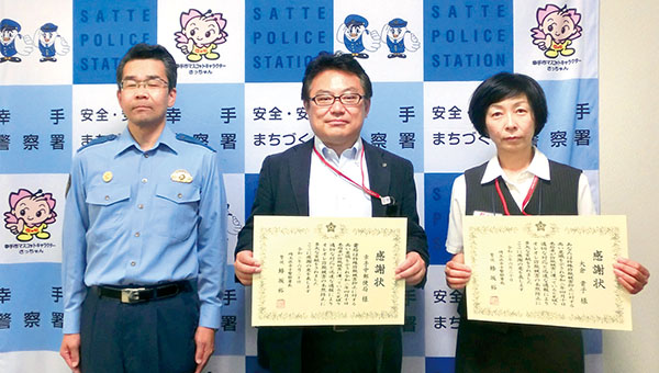 幸手署は6月30日、オレオレ詐欺被害を未然に防いだとして幸手中郵便局の長浜一哉局長(58)と大倉貴子さん(55)に感謝状を贈った。