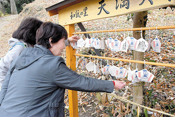 手漉き和紙の絵馬、話題に 東秩父・和紙の里、学問の神様・天満天神宮の修復を機に「絵馬掛所」も新調 2019/02/23/00:00 ビ天満天神宮の絵馬掛所に掛けられた“和紙絵馬”。下側にあるのが多羅の木の葉=東秩父村和紙の里 この写真の記事に戻る