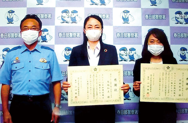 息子の依頼で…不審 高齢男性から現金下ろす相談、銀行員らが訪問し詐欺被害防ぐ 春日部署、感謝状 2020/07/14/00:00 事件 感謝状を受け取る鳥越和美支店長(中央)と阿部彩奈さん 特殊詐欺を未然に防いだとして、春日部暑は、埼玉りそな銀行春日部西口支店の鳥越和美支店長と阿部彩奈さんに感謝状を贈呈した。 2人は6月25日、高齢男性から多額の現金を下ろしたいと電話で相談を受けた。男性が息子から「投資で失敗したお金を用意してくれ」など依頼を受けていたことを不審に思い男性方を訪問。男性がだまされていたことが分かり、警察に通報。特殊詐欺の被害を未然に防いだ。 感謝状を受け取り、2人は「被害を未然に防ぐことができた。お客を守ることができてよかった」と話している。 ツイート シェア シェア 事件・事故の記事一覧 埼玉新聞のHOMEに戻る