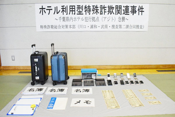 ホテルのチェックインの際に偽名を使うなどしたとして、県警捜査2課と川口、浦和、武南署は16日までに、有印私文書偽造・同行使と私電磁的記録不正作出・同供用の疑いで、住所、職業いずれも不詳の男(25)ら21~26歳の男4人を逮捕した。県警は15日、男らが滞在していた千葉市内のホテル一室を摘発し、携帯電話5台、スマートフォン7台、名簿、メモ、現金185万円などを押収。ホテルを転々としながら詐欺の電話をかけていた特殊詐欺のかけ子グループとみて調べている。