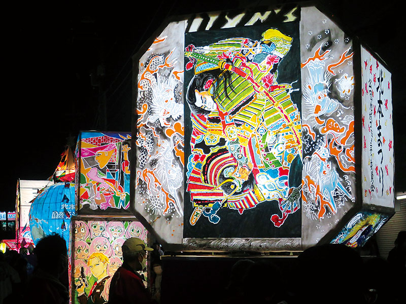 北本市の秋の風物詩「北本まつり」の宵まつりが4日、4年ぶりにJR北本駅西口・西中央通りで開かれた。扇形をした武者絵「源範頼ねぷた」をはじめ、各種北本ねぷたと囃子(はやし)山車が競演。関東最大規模の20基が運行した。