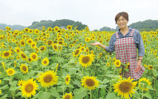 土壌改良に植えたヒマワリ、住民らに好評 切り花農家の畑で直径20センチに「周りからも喜ばれて」