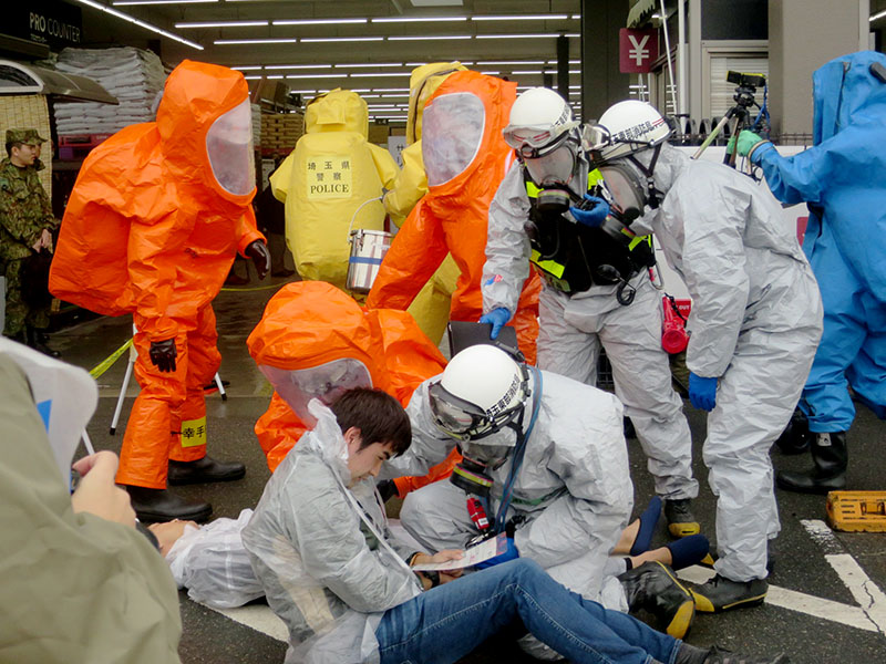 営業中の店内にサリン、救護中に刃物…大規模テロ想定、加須で500人参加の訓練 消防、警察、DMATなど連携 2023/11/19/09:09 化学防護服を着用した消防職員、警察職員が負傷者の救出救助訓練を行った=埼玉県加須市琴寄のカインズ大利根店 この写真の記事に戻る