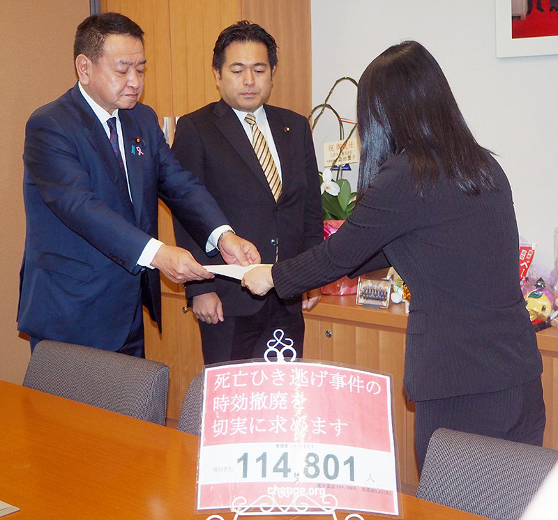 熊谷市で2009年9月、小学4年の小関孝徳君=当時(10)=が死亡した未解決のひき逃げ事件で、孝徳君の母親が22日、死亡ひき逃げ事故の時効撤廃などを求めて法務省の中野英幸政務官などに嘆願書を提出した。これまでにも同様の嘆願書を法務省に提出してきたが、政務官へ直接手渡すのは初めて。