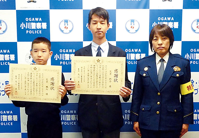 川の音で身動き取れず…目の不自由な高齢者、高1・小6の兄弟が保護 「勇気ある行動」小川署が感謝状 2024/01/10/10:56 及川直美署長(右)から感謝状を贈呈された荒井柊介さん(中央)と弟の楓向さん(小川署提供) この写真の記事に戻る