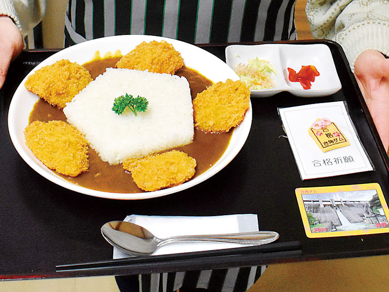 白くて丸いお皿の上に、縁起が良い五角形のライスを盛り、受験に打ち勝つ「ヒレカツ」をカレーのルーの上にトッピング。カツオを使用した「おかか和え」と、福を呼び込む「福神漬け」の小鉢二つも添えた。合角ダム上流の菩薩寺で合格祈願済みのお守りや、合格ダムカードも付く。