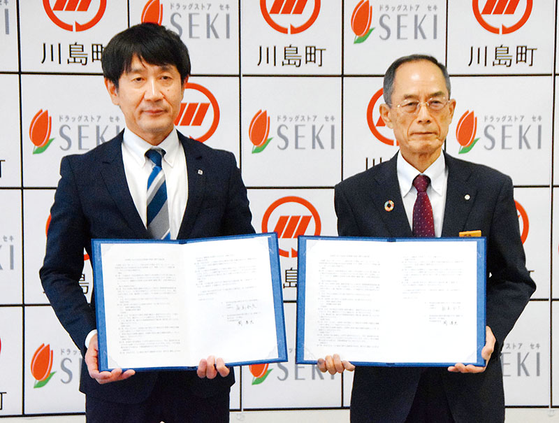 埼玉県川島町とセキ薬品(本社・宮代町)は12日、同町役場で「災害時における応急生活物資の供給協力に関する協定」を締結した。飯島和夫町長と関善夫社長が調印した。
