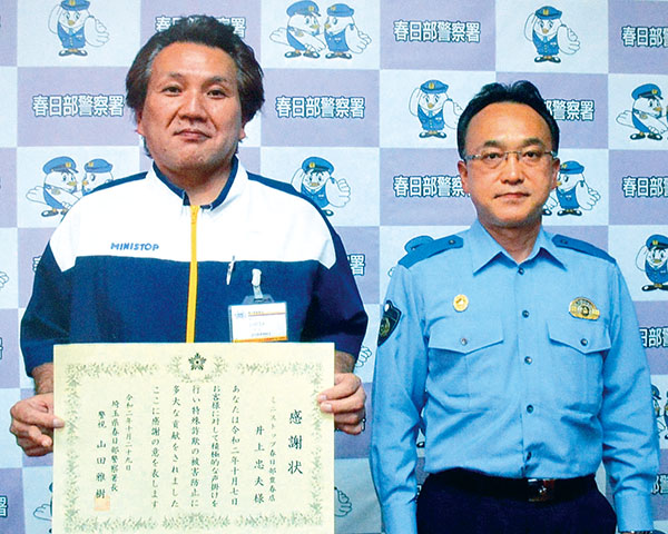 未然に被害防ぐ 電話持った客が…ミニストップ店員が通報、詐欺師に狙われた客救われる 春日部暑が表彰 2020/11/04/00:00 表彰・表敬 春日部市 感謝状を受け取る井上忠夫さん(春日部署提供) 詐欺被害を未然に防いだとして、春日部暑は市内コンビニエンスストア「ミニストップ春日部豊春店」のオーナー井上忠夫さんに感謝状を贈呈した。 井上さんは10月7日、電子マネーを購入しようと、携帯電話を手に来店した男性を不審に思い警察に通報。被害を未然に防いだ。 感謝状を受け取った井上さんは「高齢者が被害に遭わないよう、店としてもみんなで注意の声掛けをして平和な地域にしたい」とコメントしている。 ツイート シェア シェア まちの話題の記事一覧 埼玉新聞のHOMEに戻る