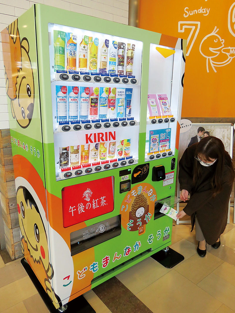 清涼飲料水の自動販売機で赤ちゃん用の紙おむつが購入可能な「子育て支援自動販売機」が1月下旬から、草加駅東口の草加マルイに登場した。