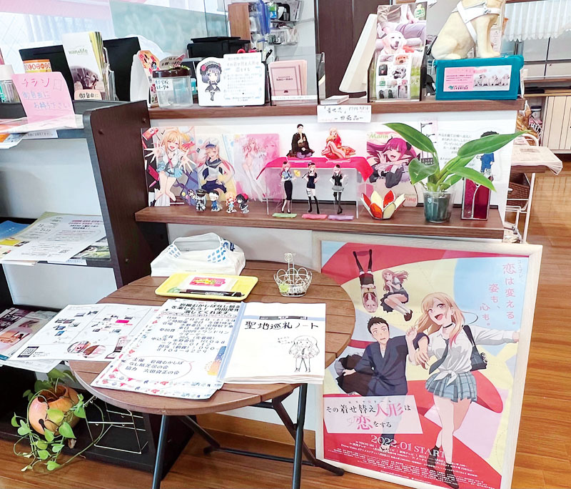 水野書店の店頭に置かれている「着せ恋」のグッズやポスター、「聖地巡礼ノート」